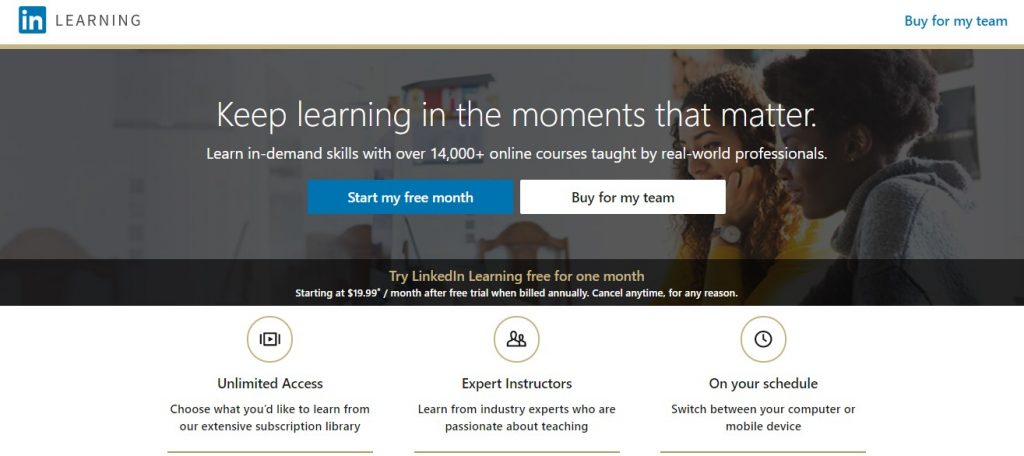 Linkedin Learning ini tuh pengembangan dari platform aplikasi pencarian kerja, Linkedin. Ada 9.000 topik yang bisa kamu ambil di platform ini, mulai dari perangkat lunak sampai akuntansi. Layanan ini bisa kamu ikuti dengan free trial selama 1 bulan.